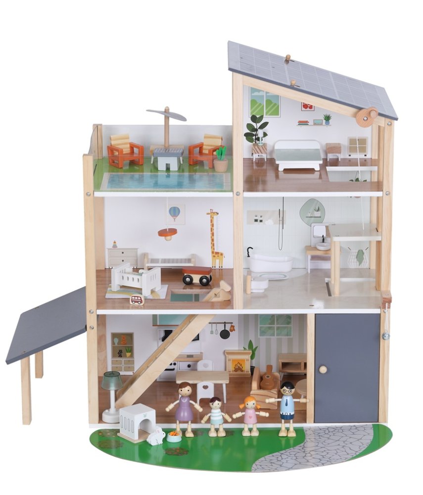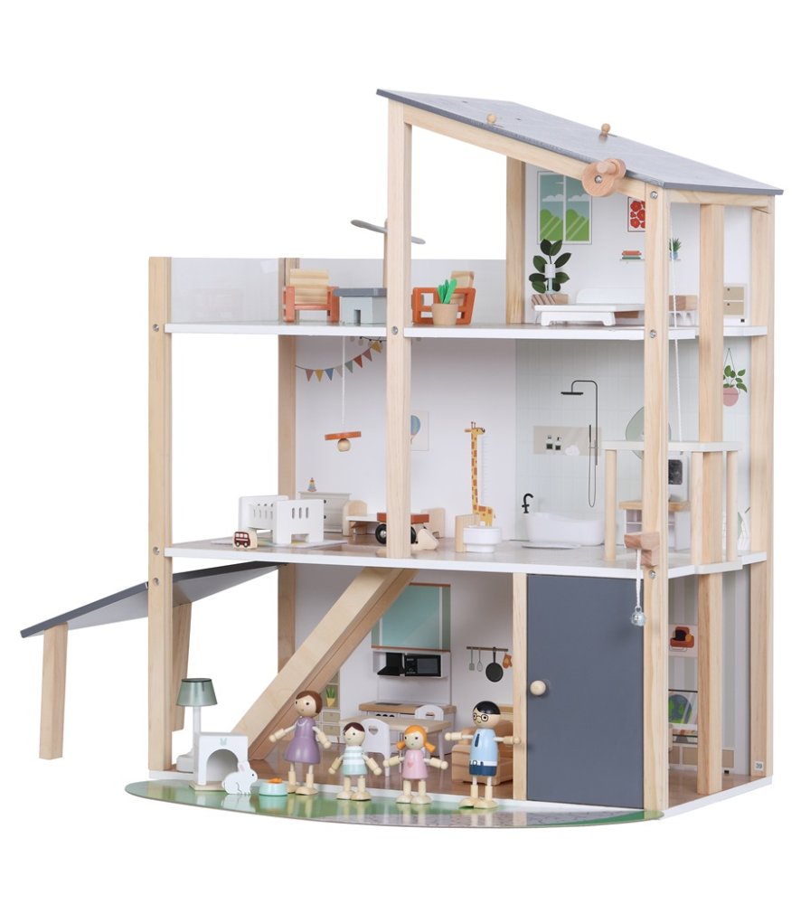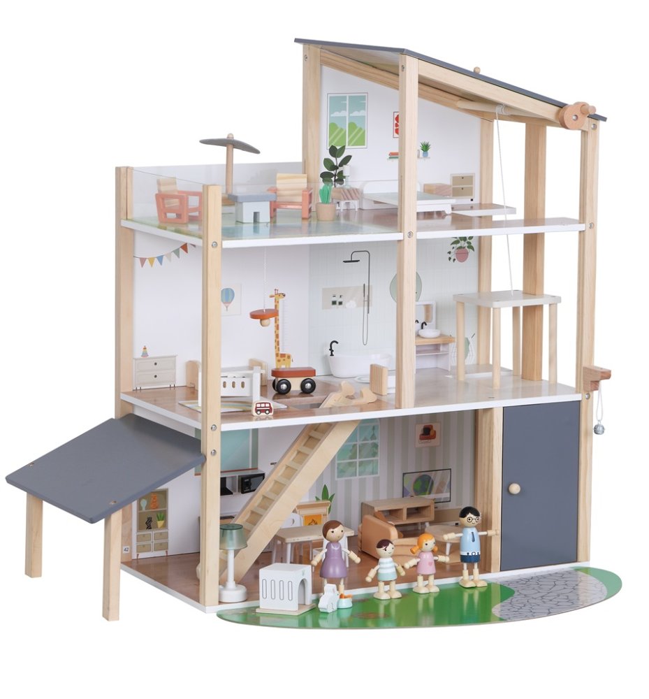 Witamy w domku, gdzie mieszka się z radością! Przestronny drewniany domek jest w pełni wyposażony w meble i akcesoria. Znajdziesz w nim przestronną kuchnię połączoną z przytulnym salonem, stylową łazienkę z wanną, pokój dziecięcy, sypialnię oraz luksusowy taras na dachu na chwile relaksu. A żeby tego było mało, nie brakuje też windy. Zakręć pokrętłem i wjedź rodzinką aż na drugie piętro. Częścią zestawu jest uroczy domowy pupil króliczek z własnym domkiem i czteroosobowa rodzina gotowa do zamieszkania i rozpoczęcia pisania swojej historii. Dzieci podczas zabawy rozwijają wyobraźnię, umiejętności społeczne i zmysł do detalu. A co najważniejsze, świetnie się bawią! Zabawne wzornictwo, delikatne kolory w połączeniu z wysoką jakością wykonania sprawiają, że ta zabawka jest pięknym dodatkiem do każdego pokoju dziecięcego lub sali zabaw. Domek jest dostarczany w stanie rozłożonym i wymaga montażu. Instrukcja montażu jest częścią opakowania. Główne cechy: 41 elementóww pełni wyposażony drewniany domek z 4 rodzinnymi figurkamiwspiera wyobraźnię, kreatywność i zabawę w odgrywanie rólprowadzi do pomysłowej zabawywysokiej jakości wykonanie i atrakcyjny designdostarczany w stanie rozłożonym, wymagany montażinstrukcja składania jest częścią opakowaniaodpowiednie dla dzieci od 3 lat
