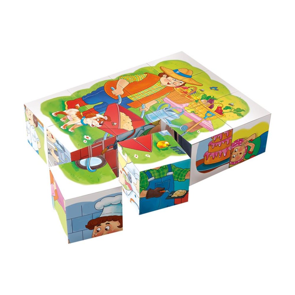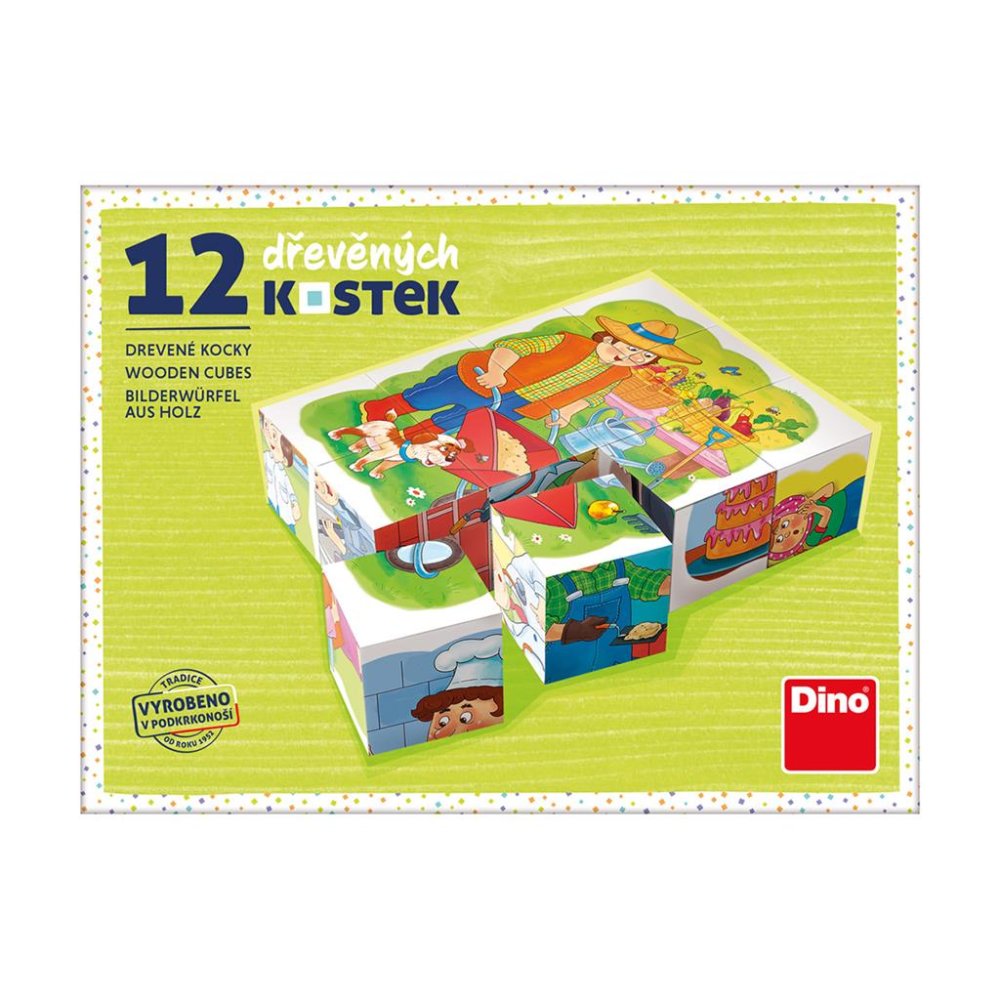 Dzieci mają mnóstwo czasu na podjęcie decyzji, czy będą piec torty, budować domy, czy uprawiać ogród, aby się utrzymać. Różne zawody mogą jednak poznawać już w młodym wieku. Na przykład za pomocą retro układanki z drewnianych kostek. Łącznie 12 kostek przedstawi dzieciom sześć zawodów, a także pomoże im rozwijać wyobraźnię, kreatywność i koordynację ruchową. W zestawie znajdują się również szablony obrazków ułatwiające budowanie. Główne cechy: Kostki są wykonane z czeskiego drewna świerkowego w naszej czysto czeskiej fabryce Dino Topa Ulubiona zabawka pomaga dzieciom rozwijać nie tylko wyobraźnię i kreatywność, ale także zdolności motoryczne Do ułożenia obrazka młodsi budowniczowie mogą użyć szablonu, starsi poradzą sobie bez niego Wysokiej jakości naturalny materiał przetrwa całe pokolenie i jest bezpieczny dla zdrowia Sprytni gracze w wieku od 3 lat będą się nimi bawić