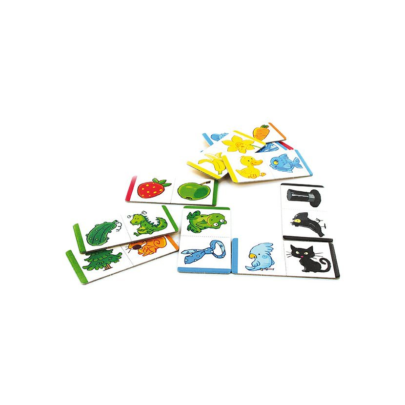 Na stole leży kartka domina. Na jednej połowie jest żółta kaczuszka, a na drugiej niebieska rybka. Teraz moja kolej. Nie mam żadnego niebieskiego domina, ale mogę dołożyć kartę, na której jest żółta cytryna lub żółty banan. Ależ to piękne, kolorowe obrazki! Dzieci uczą się rozpoznawać kolory i nazywać zwierzęta. W instrukcji znajdziesz grę dla jednego i więcej graczy. Podobnie jak inne gry z serii MÉ PRVNÍ HRY, Domino kolory jest wykonane z twardego kartonu. Rekomendowane przez Stowarzyszenie Logopedów Klinicznych Republiki Czeskiej. Może grać nawet jedno dziecko! Podobnie jak cała seria MÉ PRVNÍ HRY, to domino przeznaczone dla 1 do 4 graczy w wieku od 2 do 4 lat jest wykonane z solidnego kartonu, gwarantującego długą trwałość. Dzięki tradycyjnie wysokiemu poziomowi wykonania artystycznego dzieci chętnie się nim bawią i uczą się rozpoznawać kolory oraz świat wokół siebie. Jednocześnie ćwiczą motorykę małą, rozwijają zdolności obserwacyjne i kombinacyjne oraz uczą się logicznego myślenia. W instrukcji znajdziesz grę dla jednego i więcej graczy. Zawartość opakowania: 27 kart obrazkowego dominainstrukcja w języku czeskim i słowackim Główne cechy: poszczególne elementy dokładnie do siebie pasująrozwija logiczne myślenie i motorykęedukacyjne i zabawne