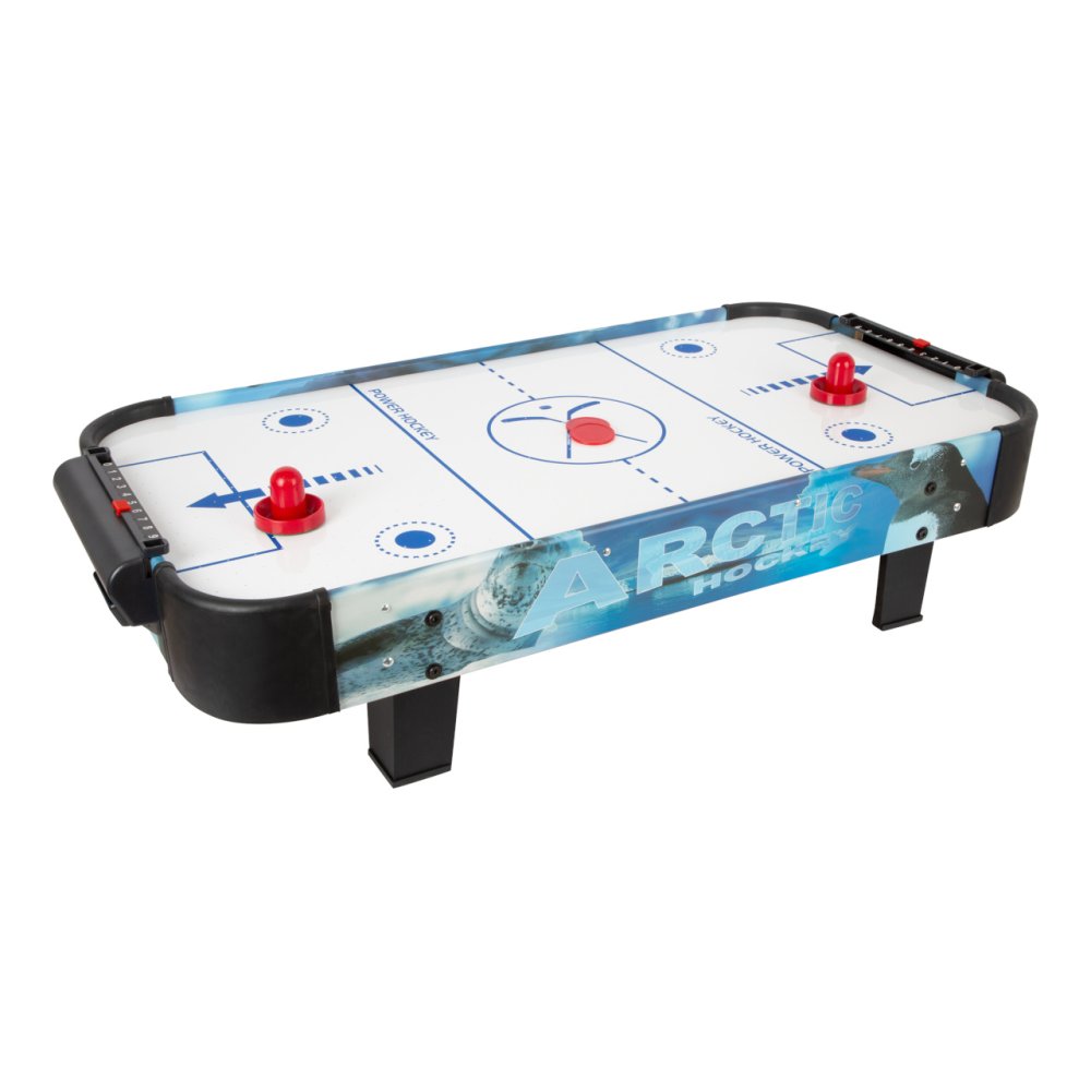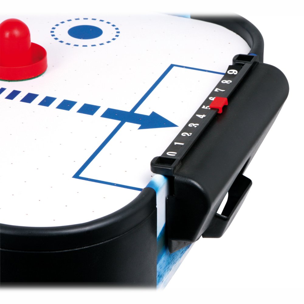 Popularny hokej powietrzny sprawdzi spostrzegawczość i zwinność dzieci. Dzięki powietrzu wdmuchiwanemu od dołu przez wbudowany wentylator krążek może gładko, ale przede wszystkim błyskawicznie ślizgać się po planszy. Gracze mają do dyspozycji stożkowe kije, którymi starają się wbić krążek do bramki przeciwnika. Kije są na spodnich stronach wyposażone w filc dla łatwego i bezgłośnego ruchu. Bramka każdego z graczy jest wyposażona w prosty licznik do rejestrowania przebiegu meczu. Grę można dzięki jej wielkości łatwo posprzątać, przenosić, lub nawet zabrać w podróż. Zasilanie jest zapewnione adapterem ze standardową euro wtyczką dla 220–240 V. Produkt wymaga montażu, dostarczany z obrazkową instrukcją do złożenia. Główne cechy: szybka, pełna akcji gra dla 2 graczystół do gry z zasilaczem, 2 kije i 2 krążkiliczniki do rejestrowania wyniku