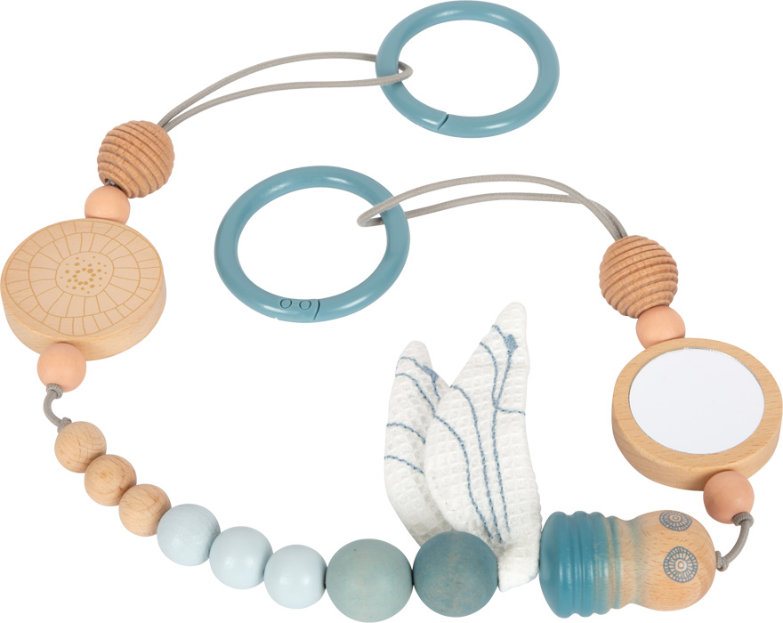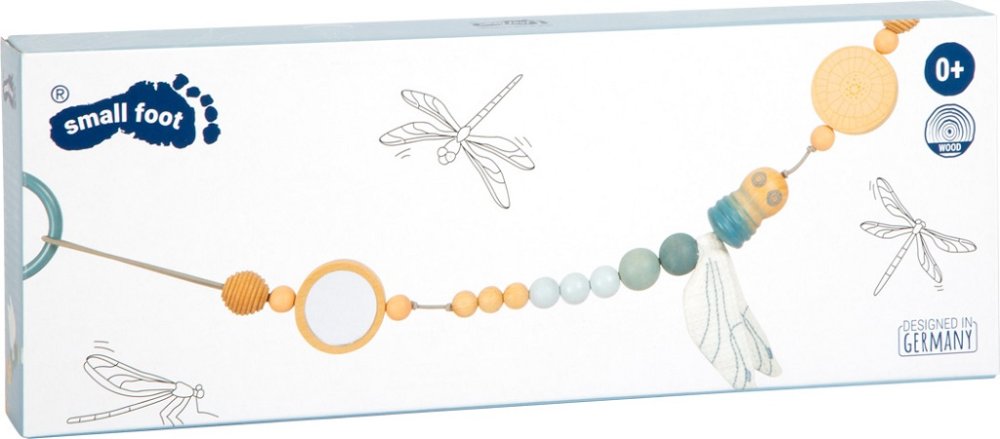 Naturalna mieszanka materiałów spotyka się z delikatnymi, nowoczesnymi kolorami, tworząc dziecięcą ozdobę do wózka, nosidełka, samochodu lub nad przewijak! W tym łańcuszku różnej wielkości drewniane kule są ułożone na elastycznej gumce i uzupełnione materiałową ważką, która ma szeleszczące skrzydła. Punkty zatrzaskowe na pierścieniach mocujących zapewniają pewne mocowanie. Długość można regulować przesuwając jedną z kulek lub skracając pasek. To idealny prezent dla noworodka lub pierwszy element wyprawki dla niemowlaka, który w zabawny sposób wspiera rozwój percepcji wzrokowej i słuchowej małego dziecka. Główne cechy: elastyczny łańcuszek w delikatnych kolorachrozwija umiejętności sensorycznenadaje się również do zawieszenia w pozycji pionowej