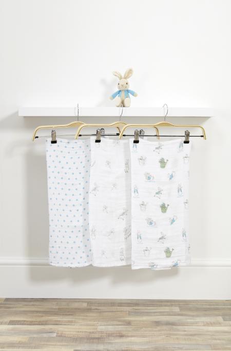 Piękny zestaw prezentowy z 3 pieluszkami muślinowymi i pluszowym króliczkiem Piotrusiem. Pieluszki mają wymiary 60×60 cm, a każda z nich ma inny nadruk. Są wykonane w 100% z bawełny i można je prać w pralce.