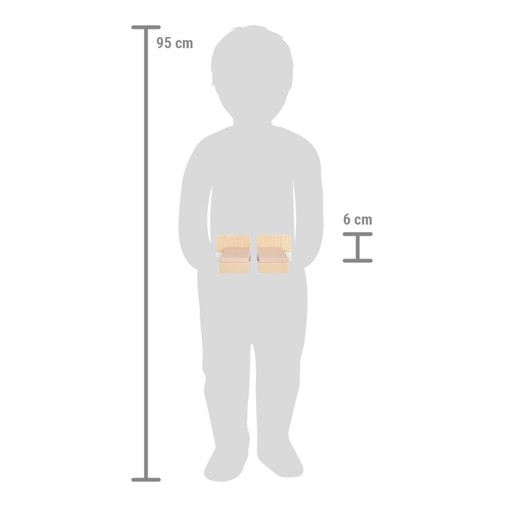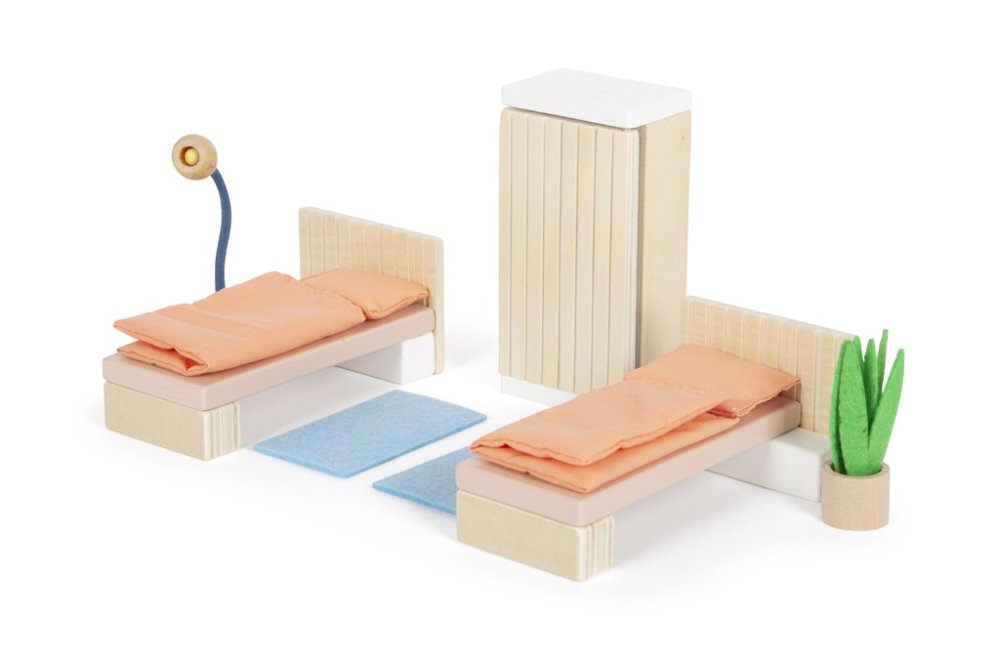 Ta sypialnia jest nie tylko pięknym dodatkiem do każdego domku dla lalek, ale także motywuje dzieci do kreatywnej zabawy i rozwija ich wyobraźnię. Jest wykonana tak, aby jak najbardziej odpowiadała prawdziwym meblom. W skład zestawu wchodzi łóżko małżeńskie, które można użyć jako dwa oddzielne łóżka, 2 poduszki i 2 kołdry, szafa z lustrem, okrągła lampa i 2 dywaniki.   Główne cechy:  nowoczesne i eleganckie meble do sypialniszczegółowe wykonanierozwija fantazję i motywuje do kreatywnej zabawy