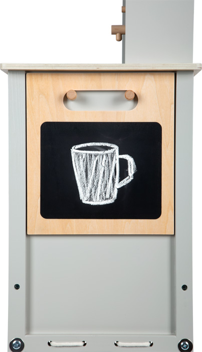 Film ma charakter wyłącznie poglądowy. Nowoczesna kuchnia dziecięca o solidnej konstrukcji w modnym szarym kolorze, połączona ze stylowymi skórzanymi uchwytami w kolorze koniakowym. Od razu gotowa do zabawy z dołączonym garnkiem z pokrywką, patelnią i metalowymi przyborami kuchennymi. Dostarczana z metalowym zlewem i obrotowymi pokrętłami, które wydają dźwięk. Częścią zestawu jest elektroniczna płyta grzewcza ze światłem i dźwiękiem oraz wysuwany okap z symbolem świetlnym. Wyjmowana blacha do pieczenia może być również używana jako tablica do rysowania. Powierzchnie w lodówce i piekarniku są zadrukowane detalami kuchennymi dla większej zabawy podczas zabawy. Dwustronny panel tylny z wysokiej jakoĹci nadrukiem imitujÄ