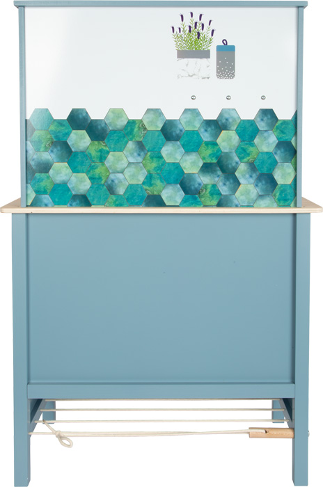 Nowoczesna kuchnia dziecięca o solidnej konstrukcji w modnym, przydymionym niebieskim kolorze, połączona ze stylowymi skórzanymi uchwytami w kolorze koniakowym. Od razu gotowa do zabawy z dołączonym garnkiem z pokrywką, patelnią i metalowymi przyborami kuchennymi. Dostarczana z metalowym zlewem i obrotowymi pokrętłami, które wydają dźwięk. W zestawie elektroniczna płyta grzejna ze światłem/dźwiękiem i wysuwany okap ze świetlnym symbolem. 2w1, wyjmowaną blachę do pieczenia można również używać jako tablicy. Powierzchnie w lodówce i piekarniku są zadrukowane detalami kuchennymi dla większej zabawy podczas zabawy. Dwustronny panel tylny z wysokiej jakości nadrukiem o wyglądzie płytek lub prostym niebieskim kolorze. Można ją idealnie uzupełnić innymi produktami i urządzeniami kuchennymi z kolekcji Tasty. Główne cechy: metalowe dodatki i akcesoriafunkcjonalne elementy, takie jak klikające pokrętła, płyta grzejna z efektem światła i dźwiękunowy, nowoczesny designzasilanie – 2 baterie 2xAA (nie są częścią zestawu)możliwość uzupełnienia o produkty z kolekcji Tasty