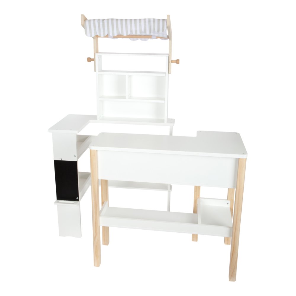 Kompaktowy, modułowo skonstruowanyý sklep z odpinaną markizą materiałową, można elastycznie wkomponować do pokoju dziecięcego. Dzięki połączeniu neutralnej bieli i naturalnego drewna, pięknie wpasuje się do każdego pokoju dziecięcego. W zestawie tablica do pisania z półką na kredę. Materiałowa markiza nadaje mu typowy wygląd sklepu. Zaokrąglone krawędzie lady zapewniają dodatkowe bezpieczeństwo. Nie zawiera akcesoriów. Główne cechy: nowoczesny i prosty skandynawski designrozwija umiejętności komunikacyjne i społeczne dzieciczęści można po grze przysunąć do siebiepasuje do pozostałych zabawek z serii produktowej Fresh