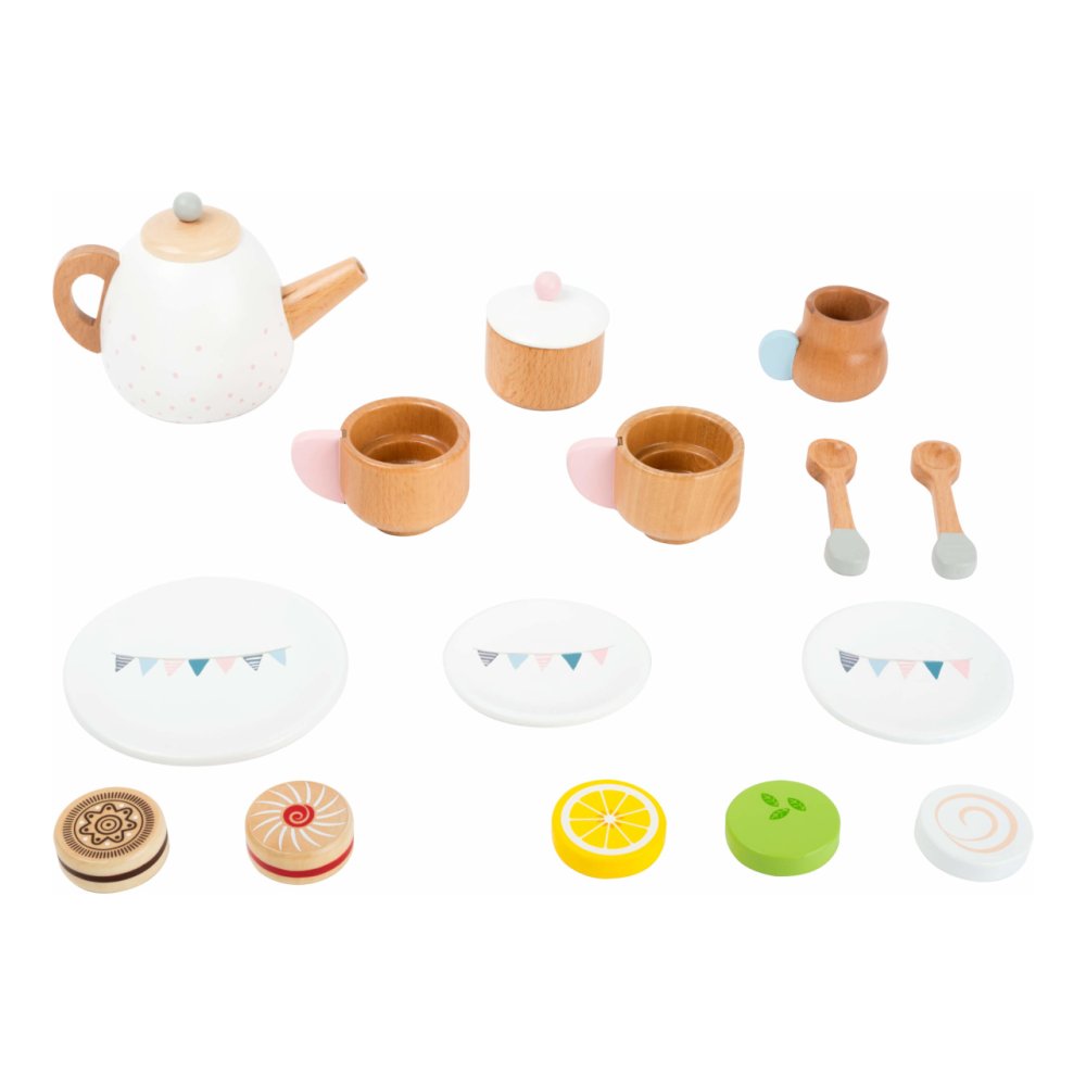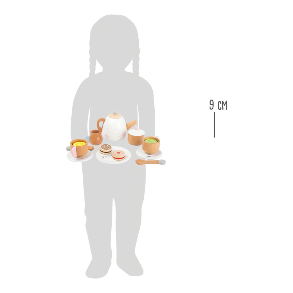 Masz ochotę na pyszną herbatę lub kawę z ciastkiem? Daj swoim dzieciom możliwość odegrania roli uprzejmych gospodarzy, pozwól się obsłużyć i rozkoszuj się z nimi słodką przerwą! Dzięki bogatemu zestawowi do herbaty dzieci mogą rozwijać wyobraźnię, uczyć się zasad obsługi i zachowania w towarzystwie. Zaskoczy Cię staranne wykonanie z litego drewna, elementy są solidne i specjalnie dopasowane do dziecięcych rączek. Naturalny materiał umiejętnie podkreśla i w zabawny sposób łączy się z delikatnymi pastelowymi odcieniami. Wykonanie kładzie nacisk na detal, pokrywki czajniczka i cukierniczki są zdejmowane, a zabawa może być jeszcze bardziej wiarygodna. Zestawem możesz odpowiednio uzupełnić dziecięcą kuchnię, stoisko lub makiety deserów. Główne cechy:czajniczek z pokrywką, 2 filiżanki ze spodkami i łyżeczkami, 3 różne kapsułki z zawartością, mlecznik, cukiernica z pokrywką, talerzyk i 2 makiety ciasteczekatrakcyjne i solidne wykonanie z litego drewna