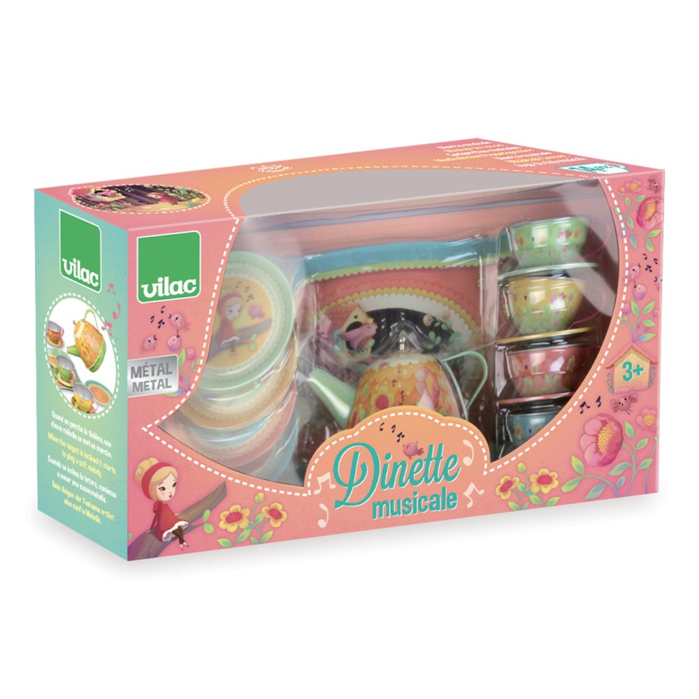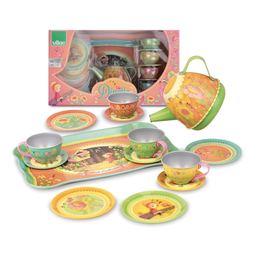 Metalowy zestaw naczyń z piękną bajkową ilustracją „magicznego lasu”, z podstawką. Ten zestaw jest wyjątkowy, ponieważ podczas serwowania gra muzykę. W opakowaniu znajdziesz 14 elementów wyposażenia: dużą tacę do łatwego przenoszenia naczyń, 4 kubeczki z podstawkami, 4 talerzyki deserowe i dzbanek, który po przechyleniu zacznie grać ładną melodię. Wielkość w sam raz dla dziecięcych rąk. Wyprodukowano we Francji. Główne cechy: zawiera 14 elementówmetalowe naczyniaczajnik kryje w sobie nakręcany mechanizm grającywyprodukowano we Francji