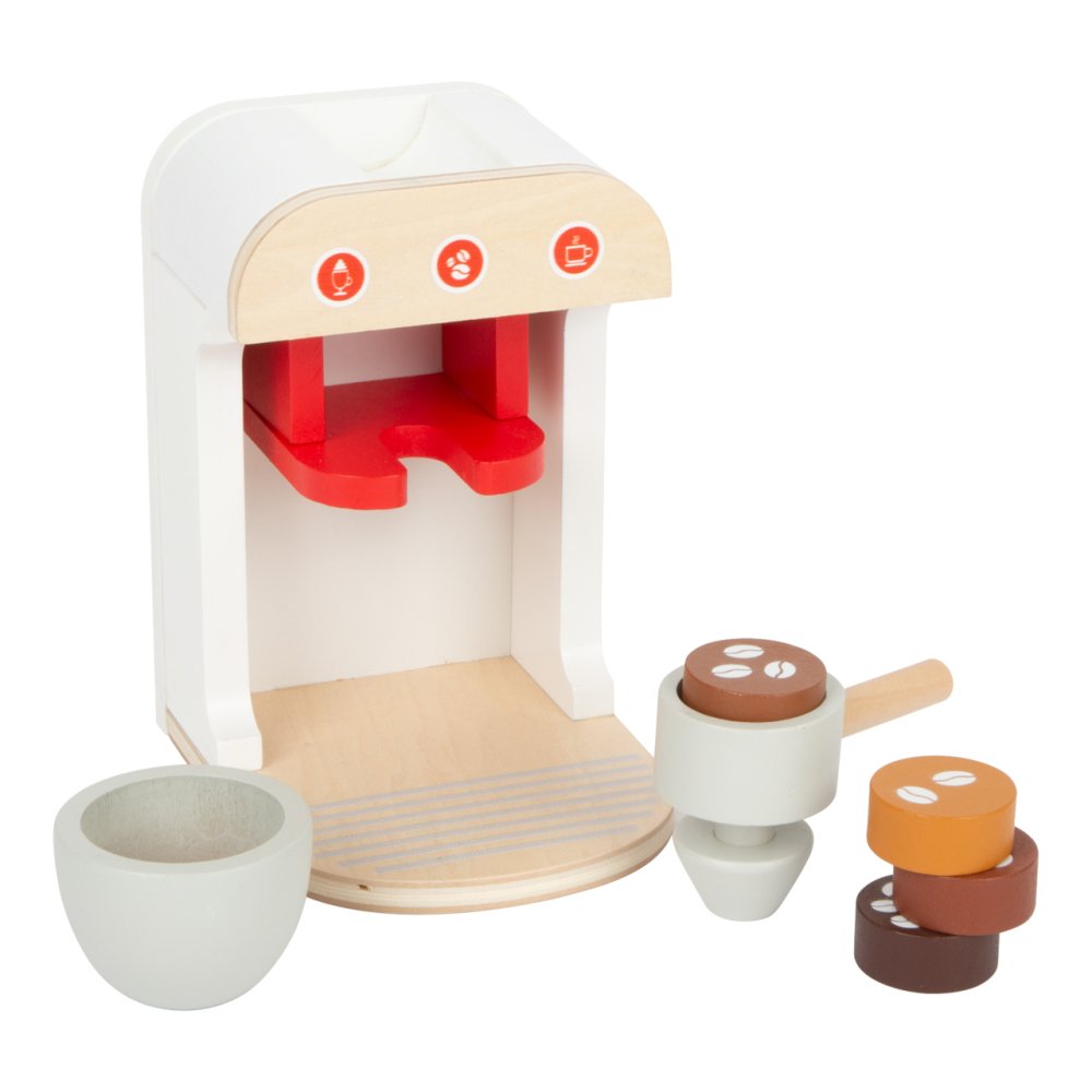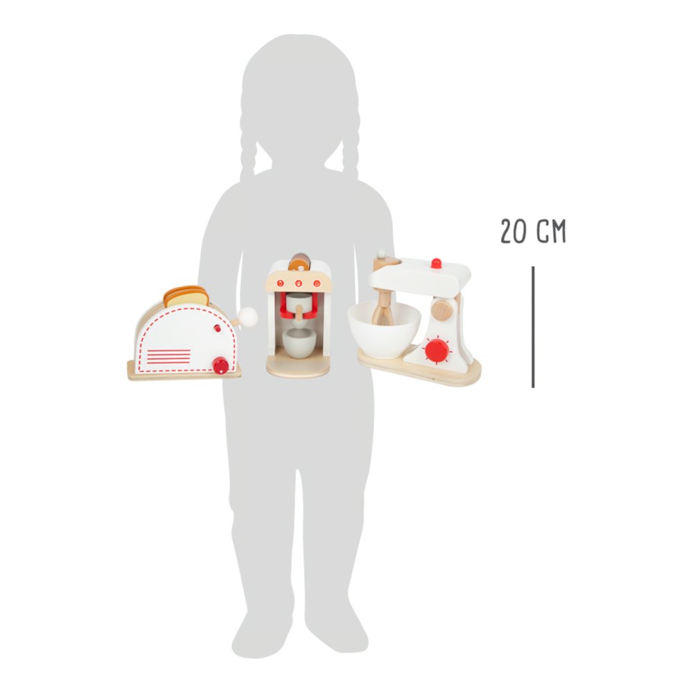 Kompletny zestaw popularnych urządzeń kuchennych! Ten zestaw oferuje toster, ekspres do kawy i mikser, czyli wszystko, czego potrzebuje każda porządna kuchnia. Drewniane urządzenia wspierają dzieci w zabawach w role, są również bardzo realistyczne. Posiadają klikające pokrętła, toster ma również dźwignię, którą „wystrzelisz“ opieczone tosty, mieszadło miksera się obraca. Ekspres do kawy ma różnej grubości ziarna kawy, dzięki czemu możesz zrobić espresso, cappuccino lub latte.    Główne cechy:mikser z misą, toster z 2 tostami, ekspres do kawy z dźwignią i 4 kapsułkami, filiżankafunkcjonalne, wyjmowane i ruchome częściklikające obrotowe pokrętłasolidne i trwałe drewniane wykonanie