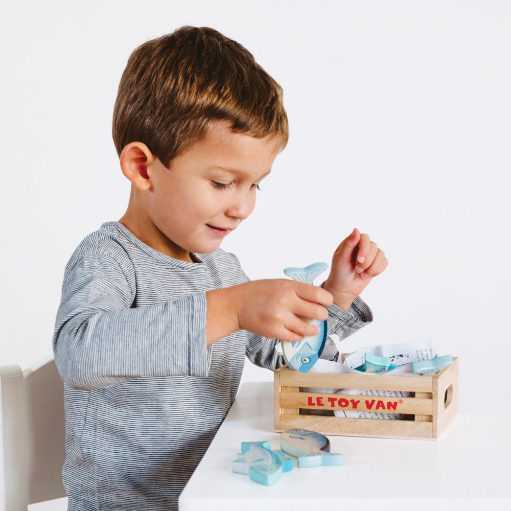 Skrzynka z rybami jest idealna do zabawy w role. Znajdziesz w niej kilka rodzajów ryb. Dzięki zabawce dzieci dowiedzą się o różnych produktach spożywczych i wadze zrównoważonej diety. Wykonane z mocnego i trwałego drewna, pomalowane nietoksycznymi farbami, rozmiar w sam raz dla małych dziecięcych rączek. Zabawka pomaga w rozwoju koordynacji i małej motoryki. Idealne uzupełnienie dziecięcych stoisk sprzedażowych i kuchni. Zabawki z celemWszystkie zabawki firmy Le Toy Van są produkowane z myślą o tym, aby służyły przez długi czas. Zaprojektowane z miłością przez doświadczonych rzemieślników przy użyciu etycznych praktyk i materiałów ze zrównoważonego rozwoju, które są bardziej przyjazne dla naszej planety. Główne cechy: wyprodukowano etycznie z drewna ze zrównoważonego rozwojuprzetestowano zgodnie z najsurowszymi standardamipomalowane nietoksycznymi farbami na bazie wodyinspiruje do pomysłowej zabawyrozwija umiejętności poznawcze Kolekcja Honeybake: Zabawki z tej kolekcji są odpowiednie do odkrywania, pomagają dzieciom w rozwoju wyobraźni, umiejętności społecznych i werbalnych oraz funkcji poznawczych. Tradycyjny design z nowoczesnymi detalami z pewnością spodoba się dzieciom. Honeybake to kolekcja Le Toy Van, która zdobyła najwięcej nagród za design, jakość, bezpieczeństwo, a także za wartość edukacyjną i zabawową.