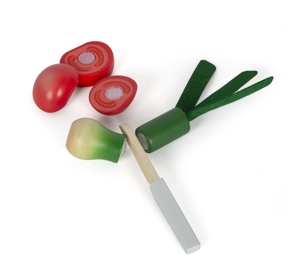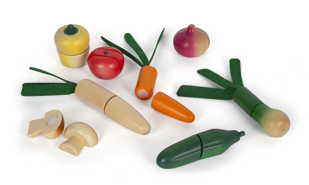 Ten duży zestaw artykułów spożywczych w praktycznej skrzynce to nie tylko niezbędny dodatek do każdej kuchni, ale także nauczy dzieci rozpoznawać podstawowe rodzaje owoców i warzyw oraz innych produktów spożywczych. Do produkcji użyto solidnego drewna, a wszystko jest realistycznie wykonane. Artykuły spożywcze są połączone rzepem, a dzieci mogą je łatwo „przekroić” za pomocą dołączonego noża. Zestaw zawiera drewniany nóż, pomidor, ogórek, marchew, jabłko, banan, grzybek, paprykę, cebulę, por, pomarańczę, melon, gruszkę, rzodkiewkę (pasternak). Opakowanie wielokrotnego użytku uczy dzieci w zabawny sposób odpowiedzialności za środowisko – ograniczać śmieci i marnotrawstwo, ponownie używać rzeczy, poddawać recyklingowi. Główne cechy: odpowiednie do kuchni dziecięcejdzięki rzepom można „pokroić” jedzenieuczy dzieci odpowiedzialności za środowiskowspiera kreatywną i pomysłową zabawę