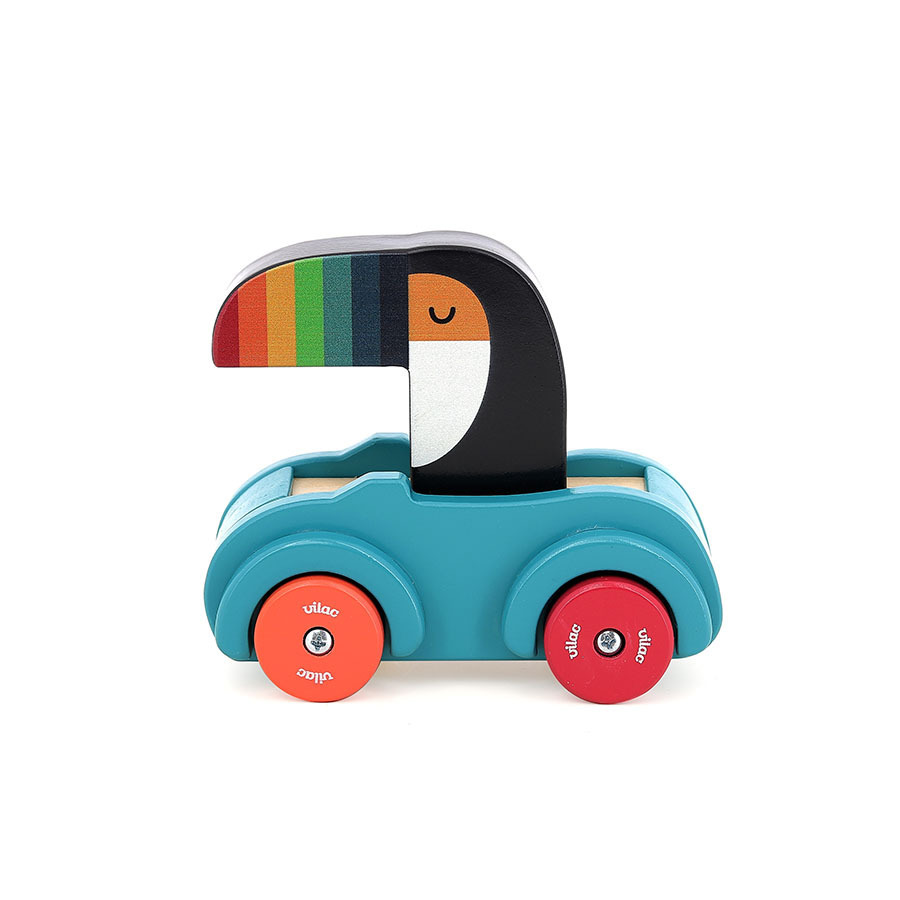 Drewniany samochodzik w kolorze niebieskim z kolorowymi kołami, w którym siedzi tukan z kolorowym dziobem. Pod tukanem wbudowany jest klakson, więc gdy dziecko naciśnie na głowę tukana, rozlegnie się dźwięk klaksonu. Ten szczegół dźwiękowy stymuluje zainteresowanie maluchów, a jednocześnie zapewnia im bezpośrednią interakcję z zabawką. Zabawka jest idealnie dopasowana do małych rączek i rozwija wyobraźnię, motorykę małą oraz koordynację ręka-oko. Główne cechy: ilustracja Andy Westfacezabawka z klaksonemrozwija motorykę małą, odkrywanie i obserwacjęwspiera kreatywność i motywuje do zabaw w wyobraźni Andy Westface to ilustrator mieszkający i pracujący w Hongkongu. Swoją pracą stara się przekazywać silne emocje i jasne myśli za pomocą prostych kształtów, kompozycji i kolorów. Typowymi elementami jego dzieł są zwierzęta i tęcza, które upodobał sobie za ich czystość, szczerość i zdolność do wzbudzania radości.