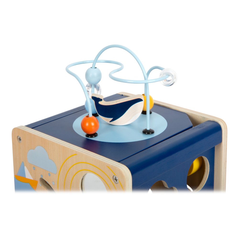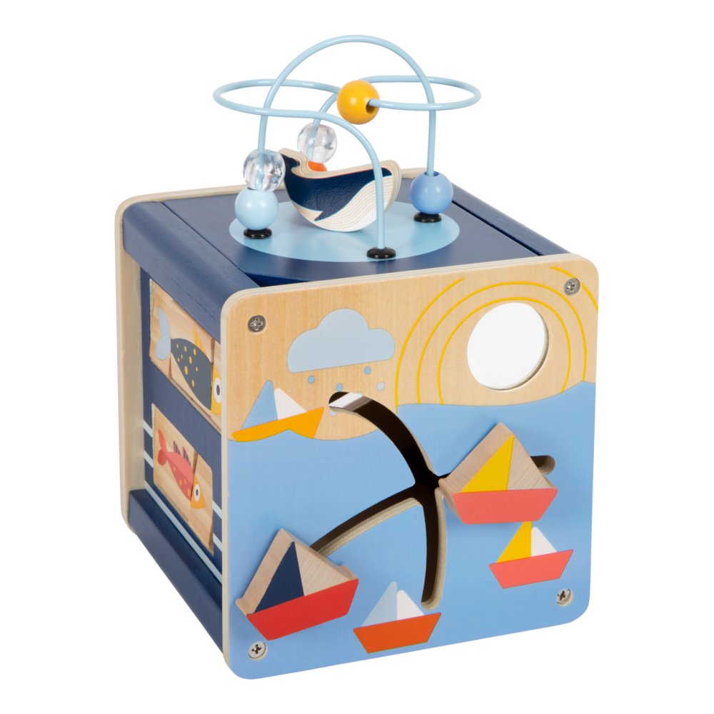 Dwa labirynty z koralikami, układanka, przesuwny labirynt i obrotowe kwadraty na pięciu ścianach. Kostka motoryczna o tematyce oceanicznej jest wykonana z solidnego drewna, a jeśli chodzi o zabawę, grę, naukę i odkrywanie, jest naprawdę wszechstronna. Ma nowoczesne kolory, dużo naturalnego drewna, ćwiczy rozumienie kolorów i kształtów, pomaga w rozwoju zręczności i małej motoryki, poprawia koordynację ręka-oko i inspiruje do pomysłowej zabawy. Nasycone kontrastowe kolory i lustro stymulują wzrok dzieci. Zdejmowaną pokrywę można schować do kostki, oszczędzając w ten sposób miejsce.Chcesz poćwiczyć motorykę? Z tą kostką to będzie pestka! Wesołe stworzenia oceaniczne zachwycą dzieci i zainspirują do pomysłowej zabawy. Nowoczesna kolorystyka i dużo naturalnego drewna sprawią, że będzie pasować do każdego pokoju dziecięcego. Wodne stworzenia będą towarzyszyć dzieciom w podróży po przygodę i obudzą ich ciekawość. Kostka ma zaokrąglone krawędzie. Główne cechy: Stabilna kostka motoryczna Pięć stron pełnych zabawyLabirynt z koralikami, układanka, przesuwny labirynt, obrotowe kwadratyWysokiej jakości ilustracje, nowoczesna kolorystyka, dużo naturalnego drewnaZdejmowaną pokrywę można schować do kostki, oszczędzając miejsceMotywy oceanicznePrzyjemna haptyka dzięki zaokrąglonym krawędziomPomaga w rozpoznawaniu kolorów i kształtów, ćwiczy zręczność i małą motorykę, poprawia koordynację ręka-oko