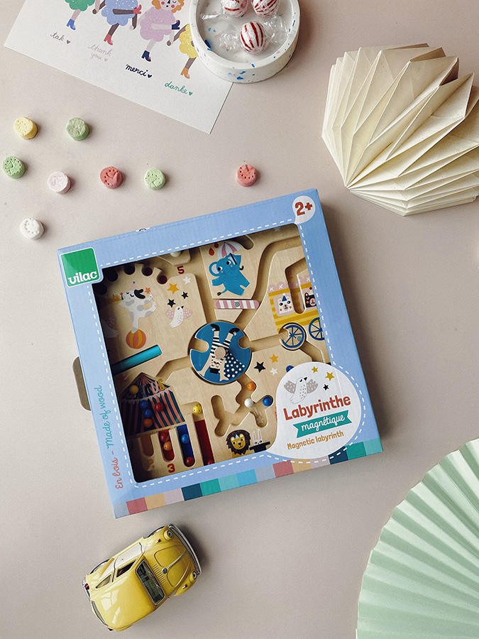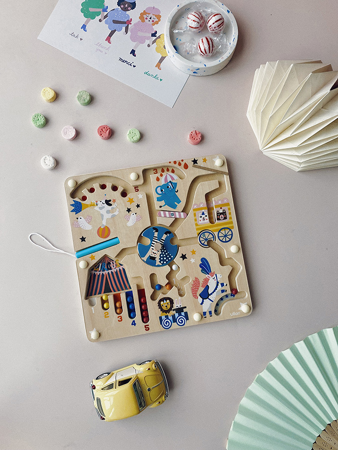 Ten magnetyczny labirynt z motywem cyrku z pięknymi ilustracjami Michelle Carlslund jest przeznaczony dla najmłodszych, aby pobudzić ich zmysły. Dzieci wyposażone w magiczne pióro pozwolą kulkom podróżować labiryntem, aby spotkać żonglującego psa i jego dwa gołębie, eleganckiego pana akrobatę, a także magicznego lwa i królika… Ale kto to zstępuje z nieba, za pomocą parasola? To niewiarygodne, latający słoń! Zapukaj do drzwi przyczepy dwóch klaunowskich niedźwiedzi, które zdradzą ci tajemnicę klaczy akrobatki! Przedstawienie się skończyło, teraz musisz dać każdą z kolorowych piłek z powrotem na właściwe miejsce: 1 białą, 2 żółte, 3 różowe, itd… kieruj się numerowaną podpowiedzią! Ta gra trenuje motorykę dzieci i rozwija ich zmysły. Główne cechy: rozwija zdolności motoryczne dzieci ćwiczy proste liczenie w zabawny sposóbdesign Michelle Carlslund Podróżuj z nami w naiwnym i eleganckim świecie duńskiej ilustratorki Michelle Carlslund, świecie delikatnych barw, który jest pełen uroczych misiów i przyjaznych ptaszków. W 2010 roku, kiedy Michelle jeszcze studiowała grafikę, wydrukowała w domu swoje ilustracje i spróbowała je sprzedać na rynku designu, gdzie spotkały się z dużym sukcesem! Kilka sklepików chciało zacząć sprzedawać jej dzieła, więc wpadła na pomysł, że fajnie byłoby zacząć działać na własną rękę. Michelle szybko stała się uznaną niezależną ilustratorką. Dziś jej ekologiczne prace graficzne można kupić na całym świecie w butikach z designem, sklepach papierniczych i sklepach dla dzieci. Michelle inspiruje się wszystkim wokół niej. Jej twórczość jest delikatna i poetycka, stylizowana i dziecięca, idealnie współgra z zabawkami firmy Vilac. „Jestem miłośniczką frytek, optymistką czasową i twórczynią ekologicznych plakatów oraz ilustratorką freelancerką z siedzibą w Kopenhadze w Danii” – tak powiedziałaby ilustratorka Michelle Carlslund, gdyby miała opisać się jednym zdaniem.