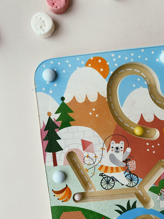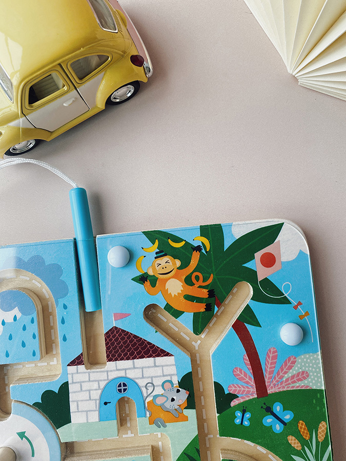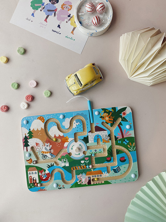 Wprowadź dzieci w poetycki świat z ilustracjami Michelle Carlslund. Za pomocą magnetycznego pisaka mogą próbować podawać poszczególnym zwierzątkom ich kulki. Czy pan kot dostanie swoje mleko, białe kulki? Rozbrykana małpka swoje banany, żółte kulki? Komu rozdać kulki innych kolorów, przyjaznemu misiu, mądremu lisowi lub zwinnej myszce? Na drodze czeka mnóstwo przeszkód i pułapek, które dzieci mogą pokonywać za pomocą swojej inteligencji. W zabawny sposób mogą trenować motorykę małą lub orientację w przestrzeni. Próbując nazwać przedstawione zwierzątka i wydarzenia oraz zrozumieć związki między nimi, można również rozwijać umiejętności poznawcze. Główne cechy: labirynt i magnetyczny pisakzabawne i bezpieczne dzięki magnetycznemu principudesign Michelle Carlslund Podróżuj z nami w naiwnym i eleganckim świecie duńskiej ilustratorki Michelle Carlslund, świecie delikatnych barw, który jest pełen uroczych misiów i przyjaznych ptaszków. W 2010 roku, kiedy Michelle jeszcze studiowała grafikę, wydrukowała w domu swoje ilustracje i spróbowała je sprzedać na rynku designu, gdzie spotkały się z dużym sukcesem! Kilka sklepików chciało zacząć sprzedawać jej dzieła, więc wpadła na pomysł, że fajnie byłoby zacząć działać na własną rękę. Michelle szybko stała się uznaną niezależną ilustratorką. Dziś jej ekologiczne prace graficzne można kupić na całym świecie w butikach z designem, sklepach papierniczych i sklepach dla dzieci. Michelle inspiruje się wszystkim wokół niej. Jej twórczość jest delikatna i poetycka, stylizowana i dziecięca, idealnie współgra z zabawkami firmy Vilac. „Jestem miłośniczką frytek, optymistką czasową i twórczynią ekologicznych plakatów oraz ilustratorką freelancerką z siedzibą w Kopenhadze w Danii” – tak powiedziałaby ilustratorka Michelle Carlslund, gdyby miała opisać się jednym zdaniem.